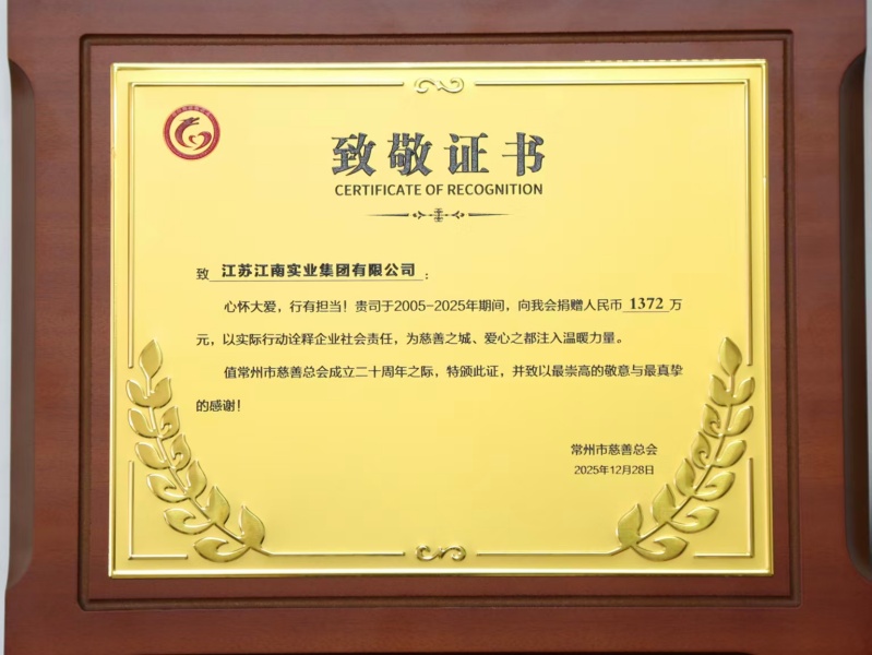 在慈善捐赠方面,集团不仅定向向常州市慈善总会捐款1372万元,累计向社会各界捐款总额更是已超亿元;在公益行动上,持续开展并稳步推进抗震救灾、扶贫扶困、捐资助学助医等活动,不遗余力回馈社会。获得 “2024年度江苏妇女儿童慈善突出贡献单位”、“2023年度常州市武进区慈善事业突出贡献奖”、“2023年度江苏妇女儿童慈善最具影响力公益项目” 等多项荣誉,彰显江南担当。